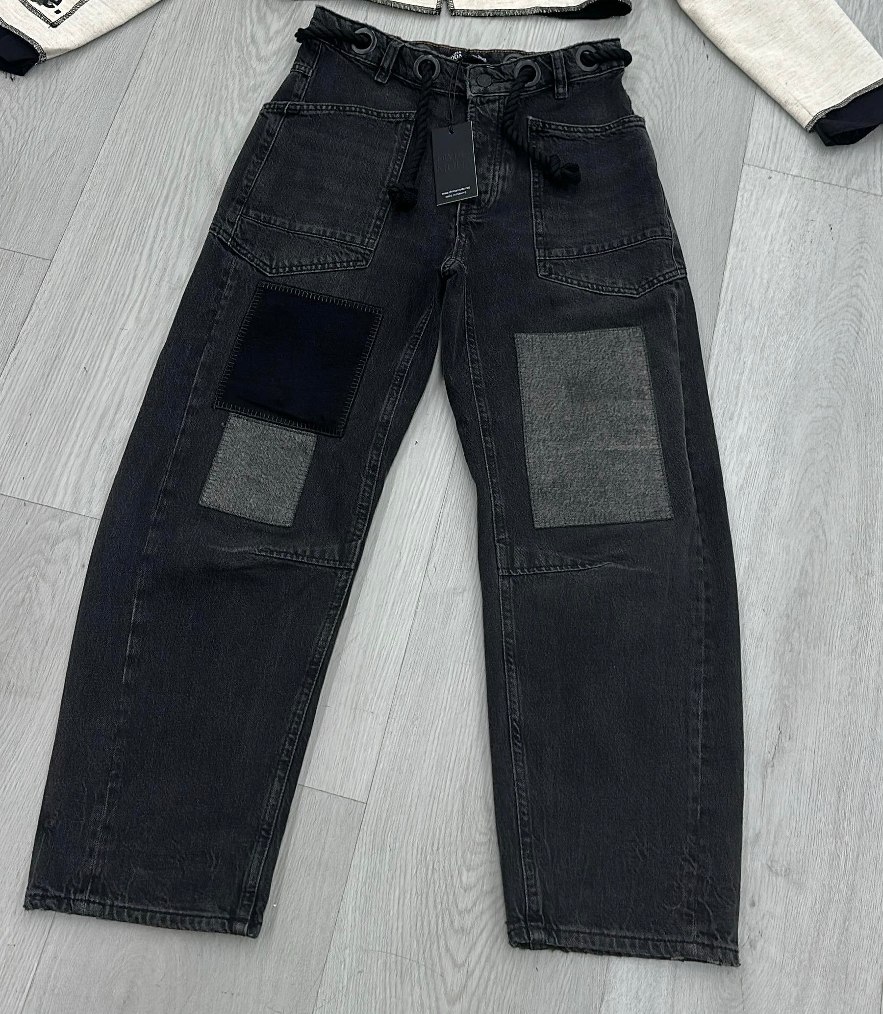 Make a bold fashion statement with these Black Denim Barrel Pants, designed with a modern edge. The barrel-leg silhouette gives them a relaxed yet structured look, while the patch details add a touch of uniqueness and street-style flair. Finished with a string belt at the waist, these jeans balance comfort with style, making them the perfect choice for effortless everyday chic. Dress them up with heels or keep them cool with sneakers—either way, they’re a standout piece for any wardrobe.
