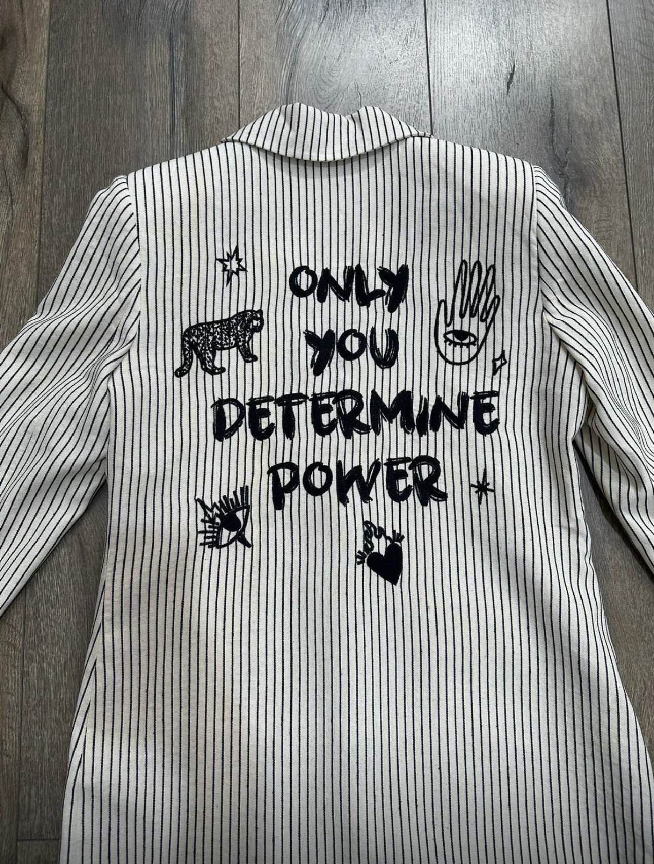 A blazer that speaks confidence and style — this beautiful piece features bold stripes that elongate the silhouette, while empowering words are delicately embroidered across the fabric, making it not just fashion but a statement. Sleek tailoring adds sophistication, while the inspirational details remind you to carry strength and grace wherever you go. Perfect to pair with trousers or denim, this blazer is designed for the woman who wears her power proudly.