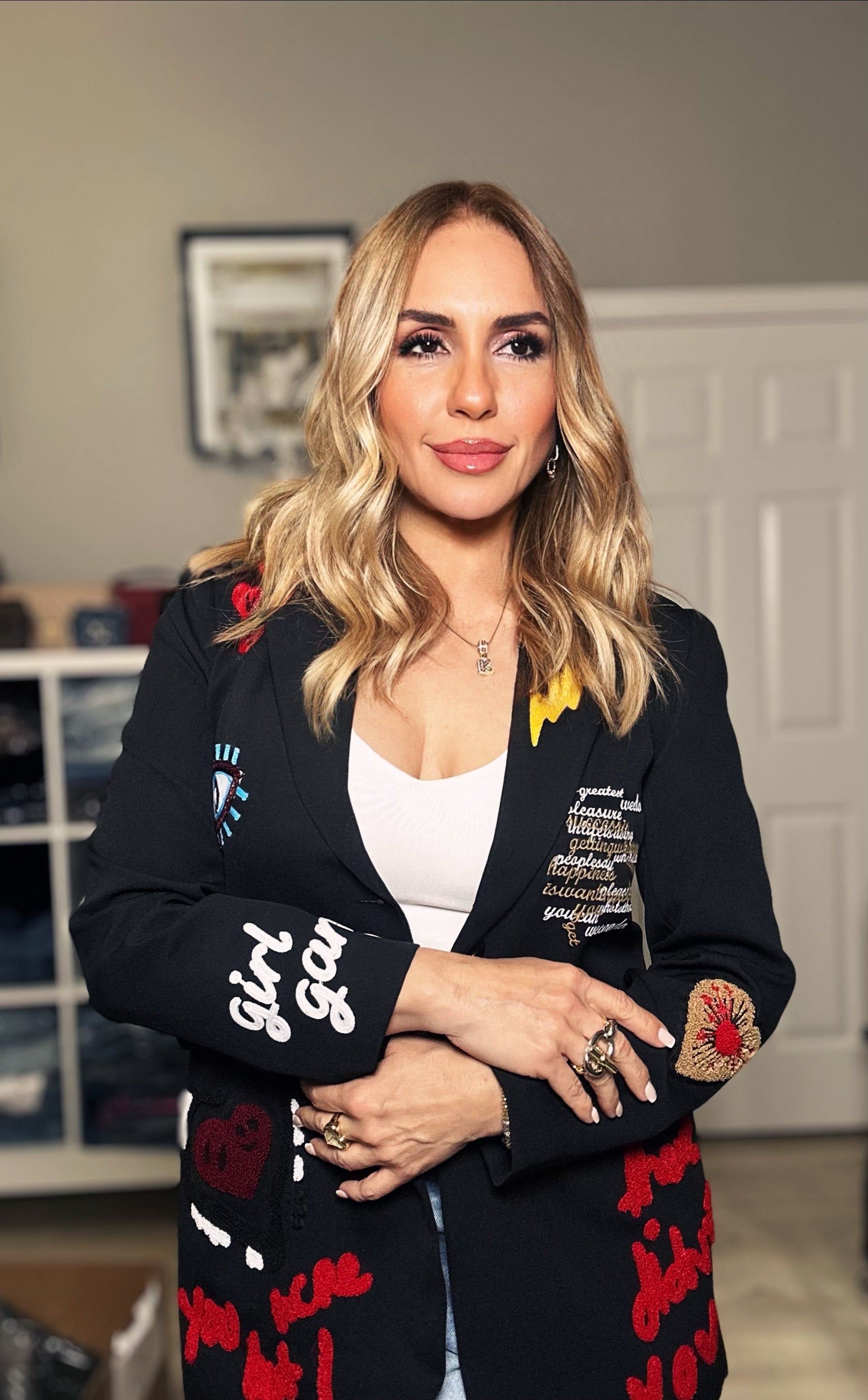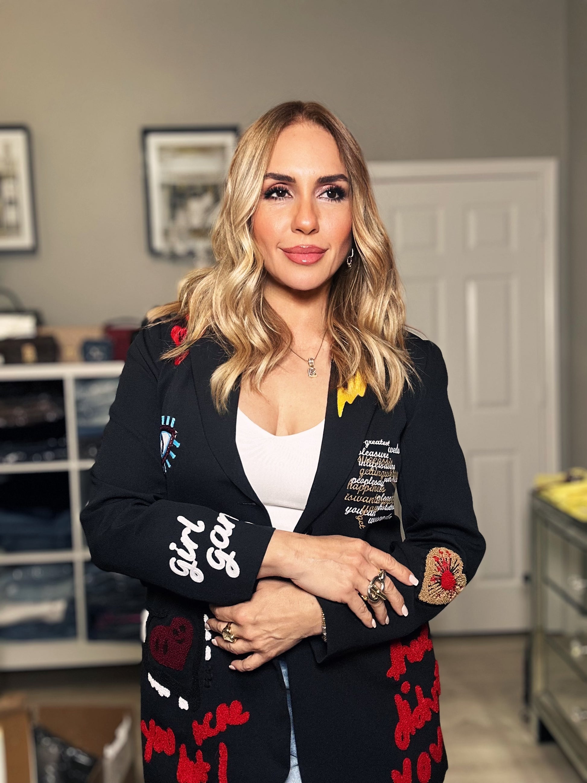This stunning black blazer is the definition of sophistication with a modern twist. Crafted in a sleek tailored fit, it features intricate embroidered designs that add a touch of artistry and uniqueness. The embroidery brings texture and depth to the classic black silhouette, making it perfect for elevating both casual and formal looks. Whether paired with chic trousers, a skirt, or even jeans, this blazer is a statement piece that combines timeless elegance with contemporary charm.
