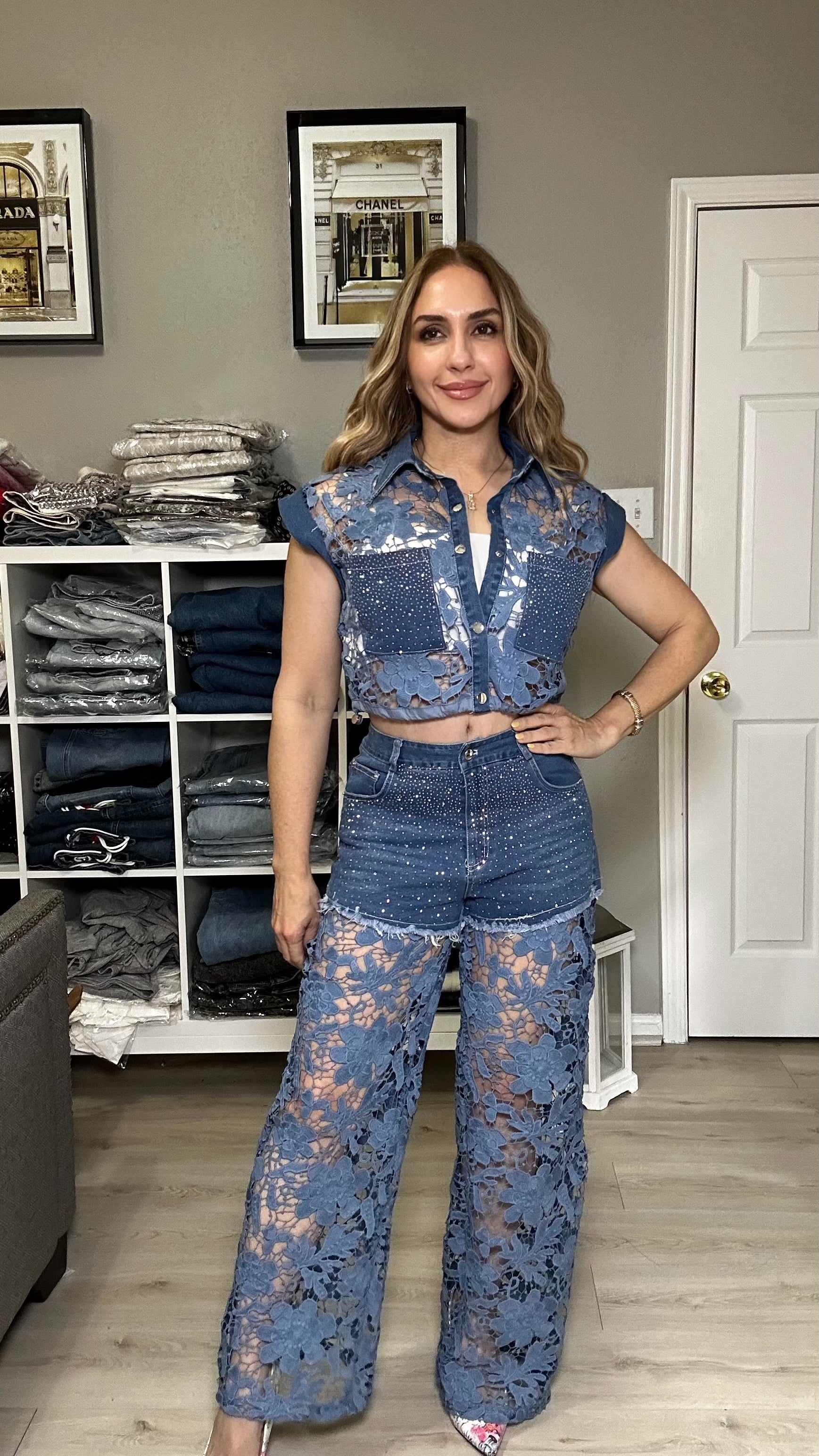 Lili Two Piece Denim Set Pants + Top Rhinestones and Crochet Details