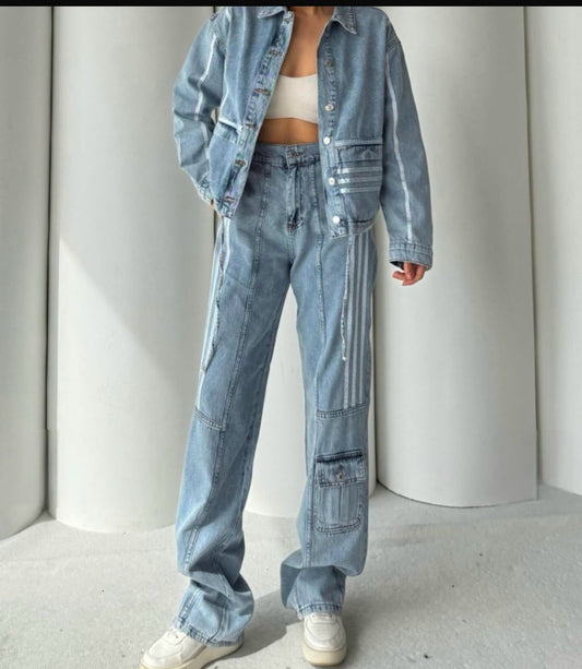 Adi Two Piece Denim Set With Stripes Pants + Jacket